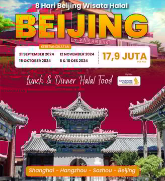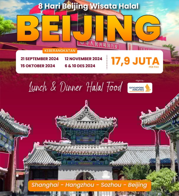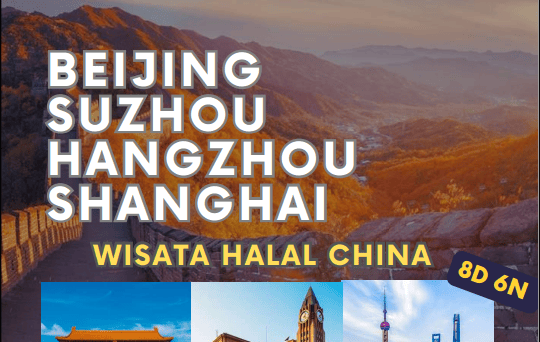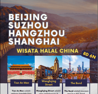 Perjalanan menjelajahi Tiongkok, mulai dari Beijing, Suzhou, Hangzhou, hingga Shanghai. Nikmati Tembok Besar, West Lake, The Bund, serta masjid bersejarah dan kuliner halal, dalam pengalaman yang memadukan budaya, sejarah, dan alam.